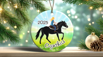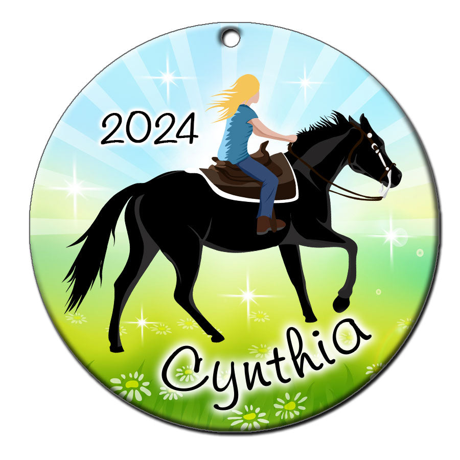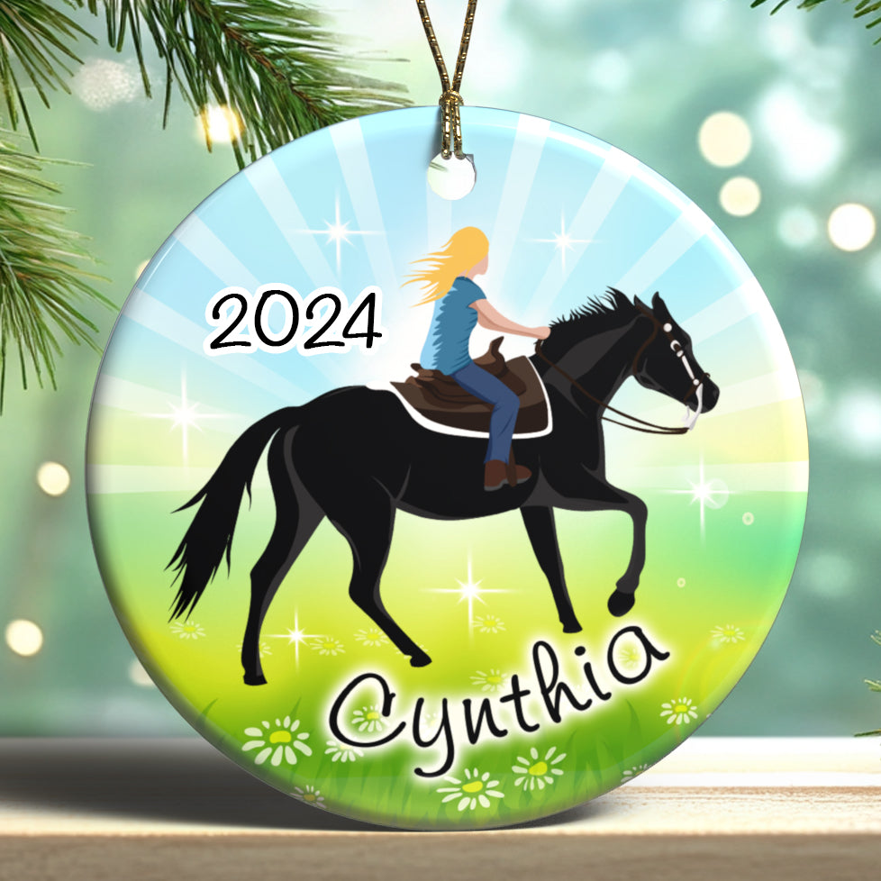 Any girl who loves horses will love this personalized Christmas ornament featuring our beautiful Horse Dreams design with a beautiful sparkling meadow background. Choose from 6 girls with different skin colors and 3 horse colors and personalize it with name and year. 2.75" flat ceramic ornament comes with gold cord for hanging.Share