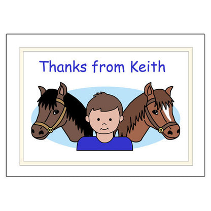 Kids who love horses will love these personalized note cards. Choose any one of our cartoon boys and any two of our cartoon horses and personalize it with your own special message and name. Cards have a gold foil border and measure 3 1/2" x 5". Price is per pack of 10 cards with white envelopes. Inside is blank.