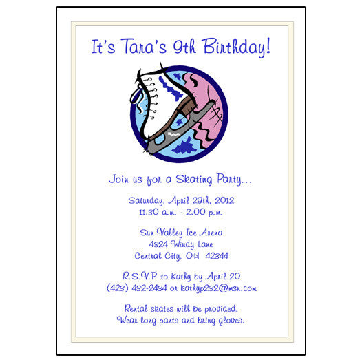 Invite your guests to chill out on the ice with these cool ice skating birthday party invitations! 5" x 7" invitations feature our ice skate design and are custom printed with your headline, text, and choice of font color. Cards are white with a pearl foil border. Price is per card. Plain white envelopes are included.