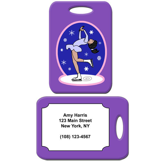 This personalized bag tag featuring our layback spin ice skating design is perfect identification for your child's backpack or bag of ice skates or figure skating gear. The front side is printed with our layback skater - choose different skin and hair colors for the girl to match your child. Back side is custom printed with your name, address and phone number. Bag tag measures 4" x 3" and is made of thick, hard durable plastic. Available in pink, purple, or light blue. Rubber strap for attaching to bag is included.Share