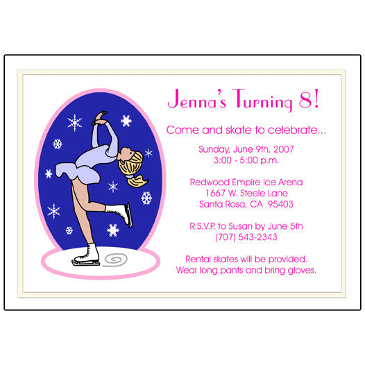 Invite your guests to join you for a spin at your ice skating birthday party! Choose from 6 skaters with different skin & hair colors to create an extra special ice skating birthday party invitation. 5" x 7" cards have a pearl foil border and are custom printed in full color with your own headline, wording, and choice of font color. Price is per card. Plain white envelopes are included.