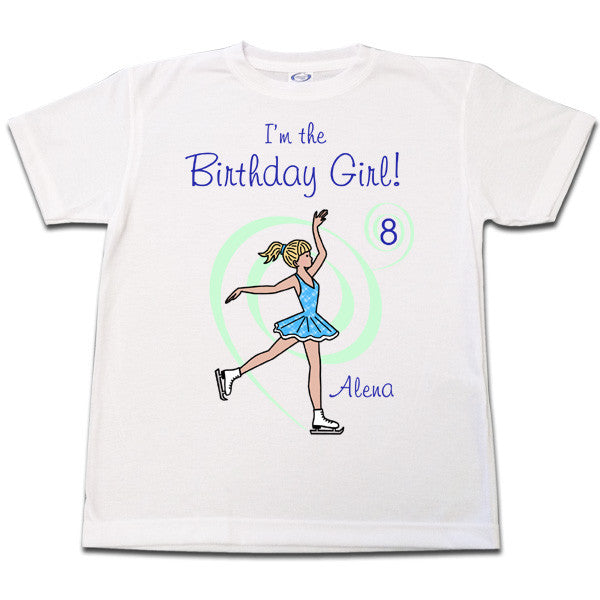Create a special personalized birthday T shirt for your daughter to wear to her ice skating birthday party. Choose from a selection of skating girls with different skin and hair colors and personalize it with your child's name and age. Sure to make the birthday girl feel extra proud on her big day.