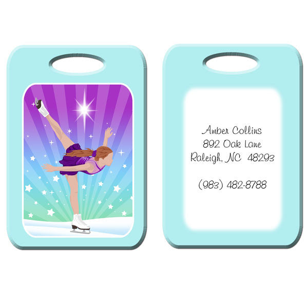 This personalized bag tag is perfect for identifying your child's backpack or ice skating bag. Front is printed with our beautiful Ice Skating Dreams design. Choose the skin and hair color of the figure skater. Your name, address, and phone # are custom printed on the back. Tag measures 4 inches x 3 inches and is made of thick durable plastic. Rubber strap included.Share