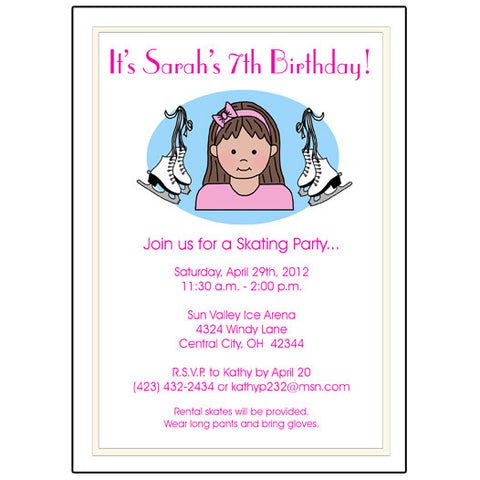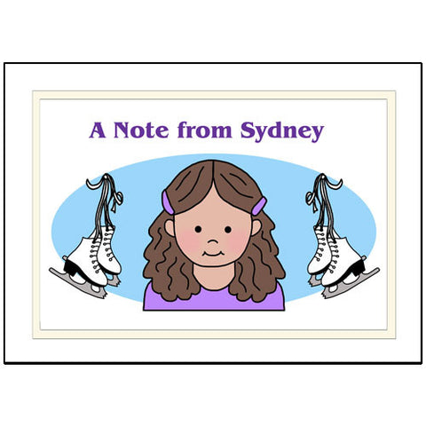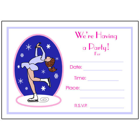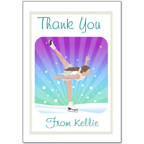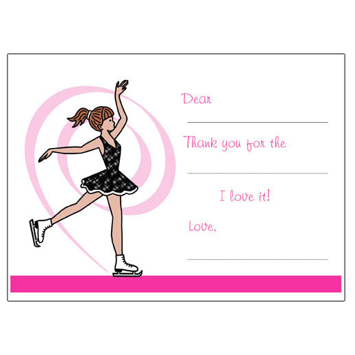 Make the task of sending thank you notes easier for young kids with our fill in the blank thank you cards! These cute cards match our girls dainty swirl skater ice skating birthday party theme. Choose from 9 ice skating girls with different skin and hair colors and customize the color of the dress and background swirl. Cards measure 5" x 7". Price is per pack of 10. Plain white envelopes are included.Share