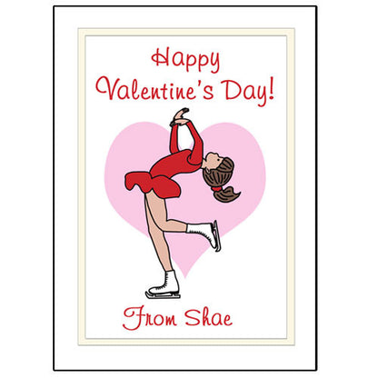 Figure skaters will love being able to send out these special ice skating Valentine's cards to all their friends. Choose from 6 ice skating girls with different skin and hair colors and personalize it with your child's name and short message. Cards measure 3 1/2" x 5 and have a pearl foil border. Inside is blank. Price is per pack of 10 note cards with white envelopes.Share