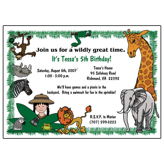 Invite your friends to take a walk on the wild side with these adorable jungle safari birthday party invitations. Choose from 10 girls with different skin and hair colors to create a special invitation for your wild animal, jungle, or safari theme birthday party. 5" x 7" cards are custom printed in full color with your own headline and wording. Price is per card. Plain white envelopes are included.
