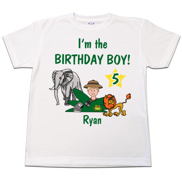 Your child will love wearing this personalized birthday t shirt which matches our jungle safari birthday party theme. Choose from 10 boys with different skin and hair colors and personalize it with your child's name and age.