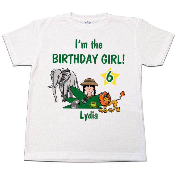 Your child will love wearing this personalized birthday t shirt which matches our jungle safari birthday party theme. Choose from 10 girls with different skin and hair colors and personalize it with your child's name and age.