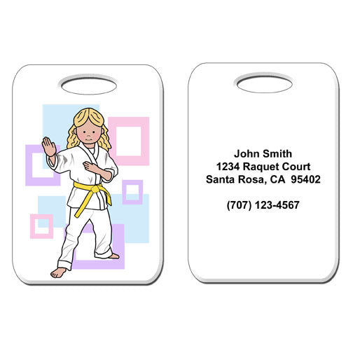 Whether she takes Karate, Tae Kwon Do or Kickboxing, girls who love martial arts will love having a special bag tag to put on their backpack or bag of martial arts gear. Front side is printed with our martial arts girl design - choose from a variety of karate girls with different skin and hair colors and even pick the belt color! Back side is custom printed with your name, address, and phone number. Bag tag measures 4" x 3" and is made of thick, hard, durable plastic. Rubber strap for attaching tag to your bag is included.Share