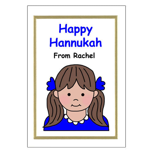 Kids will love having their own special Hanukkah cards to send to family and friends! Select any one of our cartoon girls to put on your card, and personalize it with your child's name and your choice of top message, Happy Hanukkah or Happy Chanukah. Cards measure 3 1/2" x 5 and have a gold foil border. Price is per pack of 10 with envelopes included. Inside is blank.
