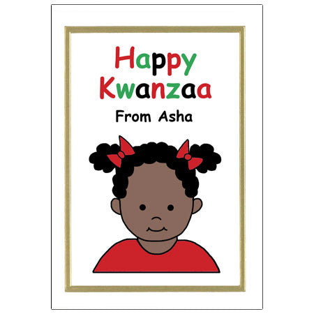 Kids love having their own special Kwanzaa cards to send to family and friends! Select any one of our cartoon boys to put on your card and personalize it with your child's name and short message. Cards measure 3 1/2" x 5 and come in packs of 10 with envelopes included. Inside is blank.We will send an email preview of your cards within 24 hrs of receiving your order (usually sooner). Please remember to check your email and reply to us with your approval or any changes you may have, as we cannot print your order until we get your approval.