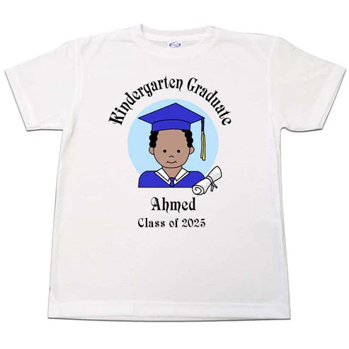 Your Kindergarten graduate will love having a special personalized T-shirt to commemorate his big day! Select any of our cartoon boys for your shirt, choose the cap & gown color, and personalize it with name and another line of text.