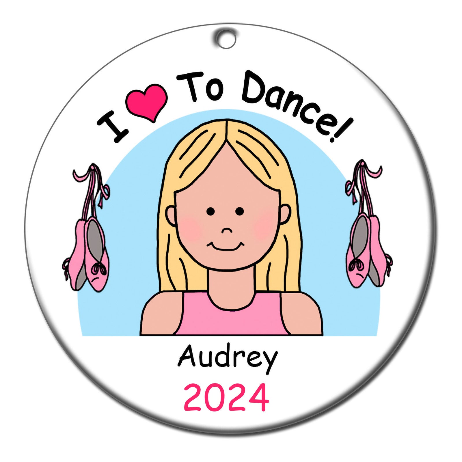 A perfect gift for any girl who loves to dance - her own special personalized Christmas ornament. Select any of our cartoon kids with any skin or hair color and personalize it with a name and year. 2.75" flat ceramic ornament comes with a gold cord for hanging.