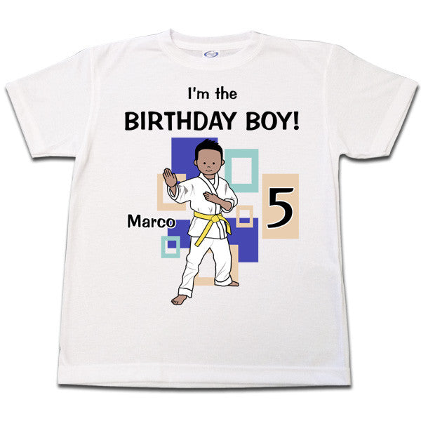 Any boy who loves karate or martial arts will feel extra proud wearing this personalized birthday T shirt on his special day. Choose from a selection of karate boys with different skin and hair colors, pick a belt color and background color scheme. Personalize it with your child's name and age. Perfect for wearing to a karate or martial arts theme birthday party.