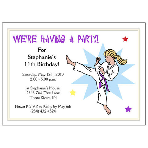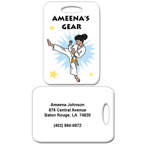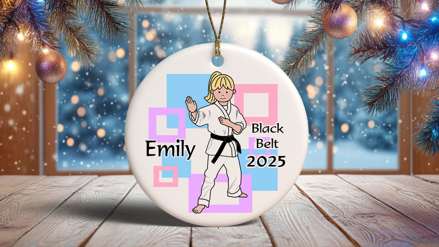 A perfect gift for any child who loves karate, tae kwon do, or other martial arts - a personalized Christmas ornament featuring our martial arts girl design. Select from 32 karate girls with different skin and hair colors, and even choose the belt color. Personalize your ornament with name and year. 2.75" flat ceramic ornament comes with gold cord for hanging.