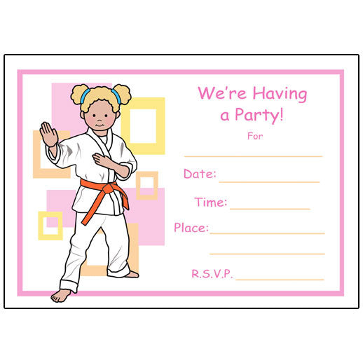 Invite your guests to kick off a good time at your karate or martial arts birthday party! Choose from 32 girls with different skin & hair colors and select a belt color and background color scheme to create your own fill-in-the blank party invitations. Cards measure 5" x 7" Price shown is for a pack of 10 invitations with plain white envelopes.Share