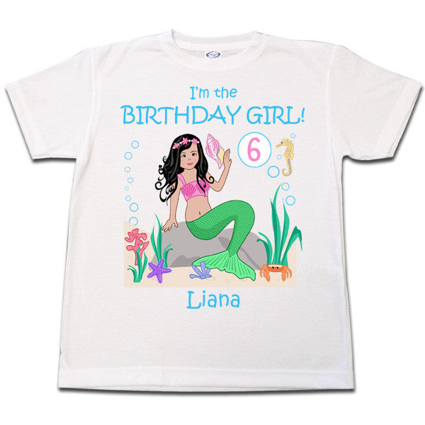 Any birthday girl who loves mermaids will enjoy wearing this special personalized mermaid birthday T shirt. Select from 21 mermaids with different hair, skin & outfit colors and personalize it with your child's name and age. Perfect for wearing to your mermaid theme birthday party.