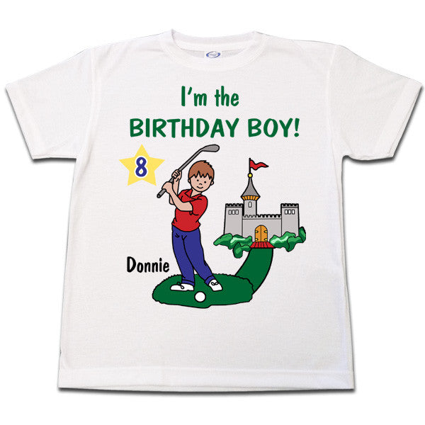 Create a special personalized birthday T shirt for your son to wear to his mini golf birthday party. Choose from a selection of boys with different skin and hair colors and personalize the shirt with your child's name and age.