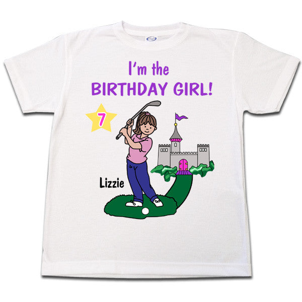 Create a special personalized birthday T shirt for your daughter to wear to her mini golf birthday party. Choose from a selection of girls with different skin and hair colors and personalize the shirt with your child's name and age.