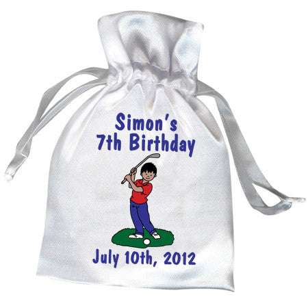 White satin drawstring favor bags printed with our Mini Golf design for boys are perfect for children's birthday parties. Choose from 9 boys with different skin and hair colors and personalize it with 2 lines of text.