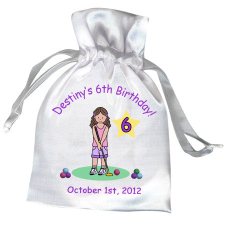 White satin drawstring favor bags printed with our girls mini golf design are perfect for kids mini golf theme birthday parties. Choose from 40 girls with different skin & hair colors, and personalize it with 2 lines of text.