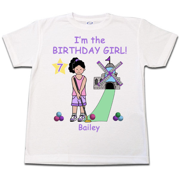 The birthday girl will feel extra proud wearing this personalized mini golf birthday T shirt to her miniature golf party. Choose from a selection of girls with different skin and hair colors and personalize the shirt with your child's name and age.