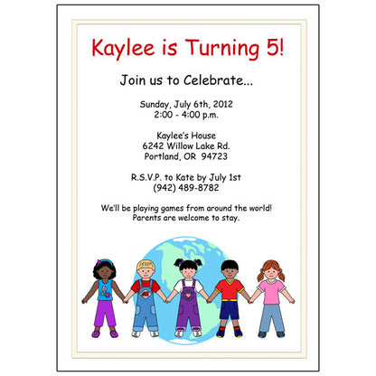 Having a party with a multicultural theme? Choose any 5 of our multicultural kids for this cute party invitation. We'll custom print it with your text and choice of font and font color. Price is per card. Cards measure 5" x 7" and white envelopes are included.Turnaround time: We will send an email preview of your invitations within 24 hrs of receiving your order (usually sooner). Please remember to check your email and reply to us with your approval or any changes you may have. Your invitations will be printed and shipped out within 1-2 business days from the time we receive your final approval of the preview.