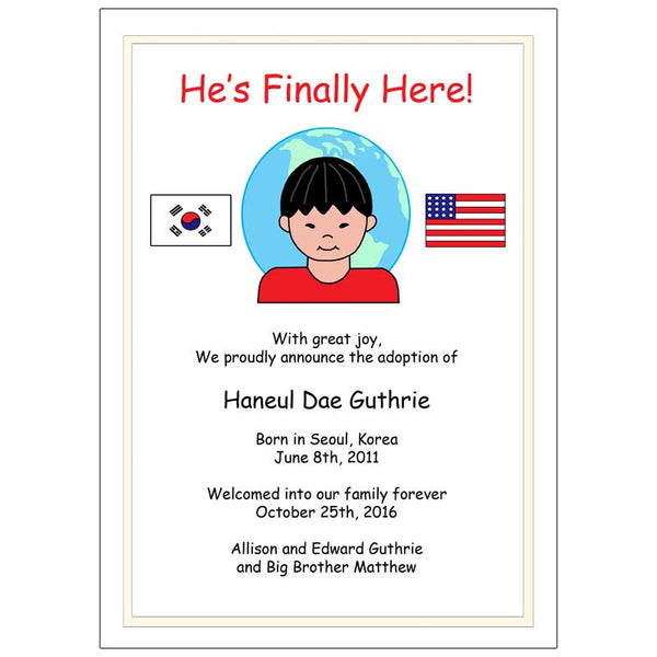 This adorable adoption announcement will work for the adoption of a baby, toddler, or older boy from any country. Select a cartoon boy, choose their skin and hair color, and include flags from any 2 countries. We'll custom print your announcements with the headline and text of your choice. A perfect way to share the joy of your new arrival with your family and friends. Announcements measure 5" x 7" and are printed on quality white cardstock with a raised shiny pearlized border. White envelopes are included. Price shown is for each single card with envelope. There are no minimum orders or setup fees - order as many or as few as you need.