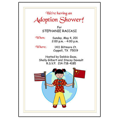Custom printed invitations for older child adoption! Available for boys or girls from China, Vietnam, Korea, Guatemala, India, Haiti, Russia, and Ukraine. We'll custom print your invitations with any headline and text of your choice. Cards measure 5" x 7" and are printed on quality white cardstock with a raised shiny pearlized border. White envelopes are included. Price shown is for each single card with envelope. There are no minimum orders or setup fees - order as many or as few as you need!