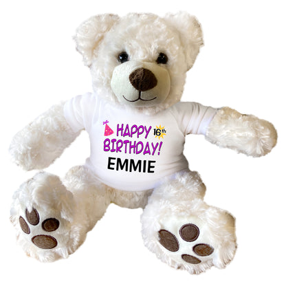 Commemorate a special birthday with a personalized birthday teddy bear! 13 inch pearly white teddy bear will arrive wearing a white T-shirt with Happy Birthday design, personalized with name and age.