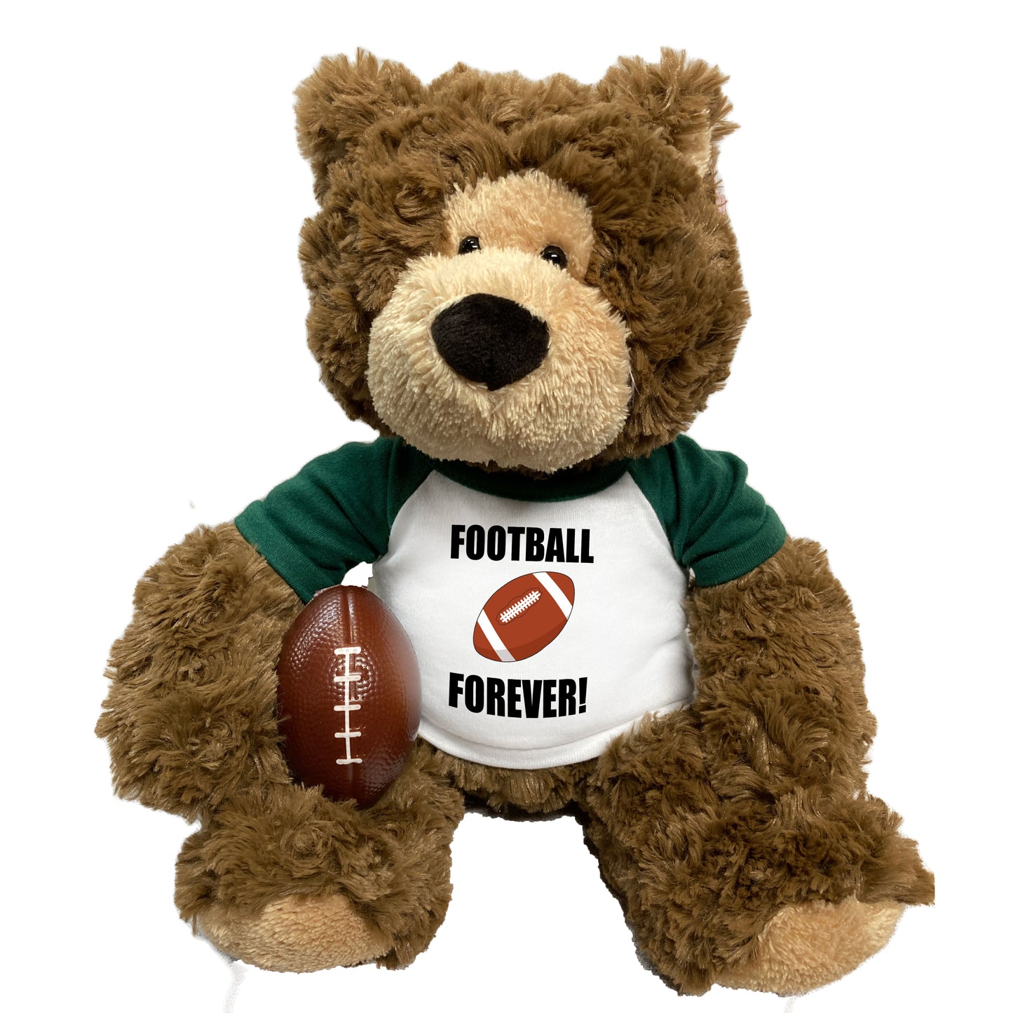 High quality 14" two-toned brown teddy bear will arrive wearing a T-shirt personalized with any 2 lines of text on the front along with a football design. Choose a shirt to match your team colors - shirt is available with Green, Royal Blue, Red, Orange, Purple, Pink or White sleeves.