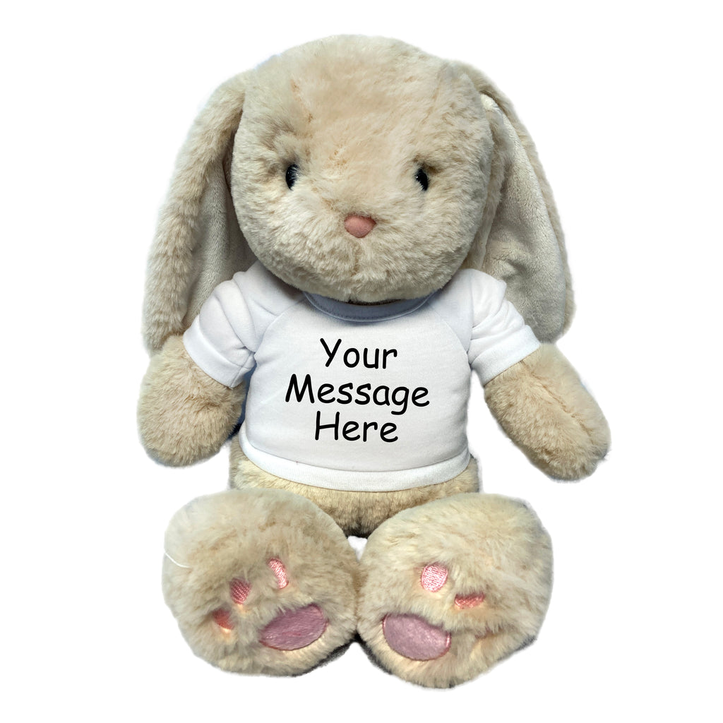 This adorable 14" cream colored stuffed bunny rabbit makes a great gift for Easter or any other occasion! Cream Brulee bunny is extra soft with silky fur and adorable pink paw pads on the feet. Your bunny will arrive wearing a T shirt personalized with your message and one of our graphics or your own photo, or logo. If you are putting a photo or logo on your stuffed animal T shirt, please upload a large, high resolution image using the link above (.jpg or .png format). *Please note: We cannot print copyrighted images unless you have a signed release form.