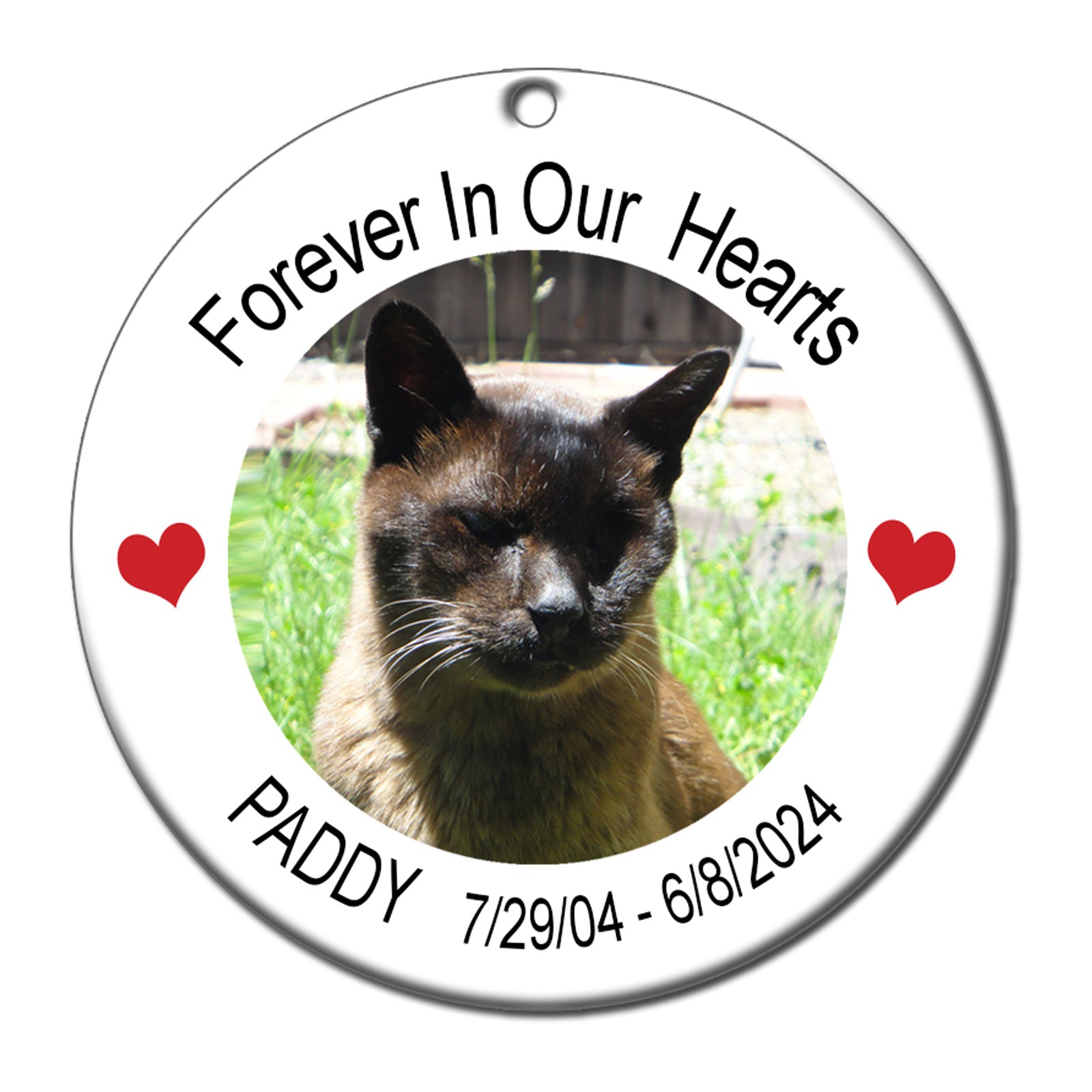 Create a special ornament in memory of your beloved pet. Your favorite photo of your pet will be printed in the center of the ornament with your choice of wording on top and your pets names and dates below. 2.75" flat ceramic ornament comes with gold cord for hanging.