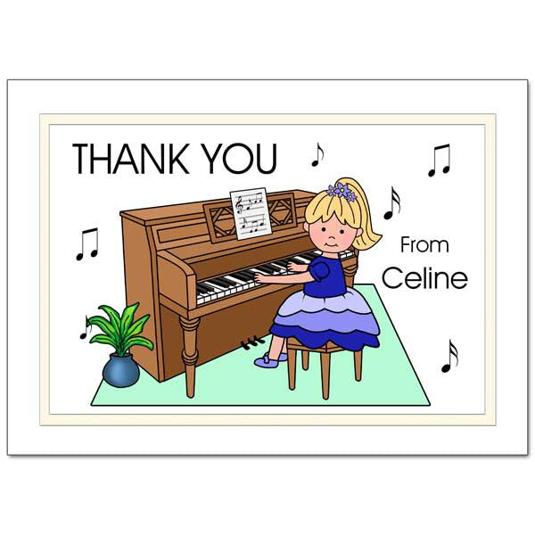 Thank your guests for coming to your piano recital or music themed party with these adorable piano girl thank you notes. Select the skin and hair color of the piano playing girl to resemble your child and even choose her dress color. Folding cards measure 3.5" x 5" and have a pearl foil border. Inside of the cards is blank. Price is per pack of 10 with envelopes.Share