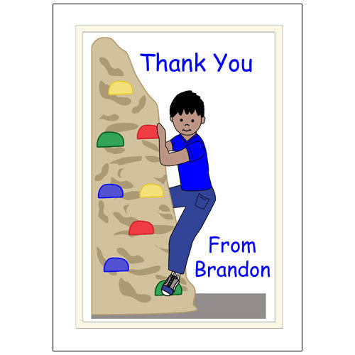 Thank your guests for coming to your rock climbing birthday party with these personalized rock climbing thank you notes for kids. Choose from 9 boys with different skin and hair colors and personalize your note cards with your child's name and short message. Cards measure 3 1/2" x 5 and have a pearl foil border. Inside is blank. Price is per pack of 10 note cards with white envelopes.Share