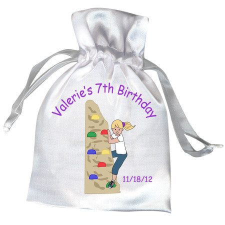 White satin drawstring favor bags printed with our rock climbing girl design to match our rock climbing birthday party theme! Choose from 9 girls with different skin & hair colors, and personalize it with 2 lines of text. Price shown is per bag and includes your personalized printing.