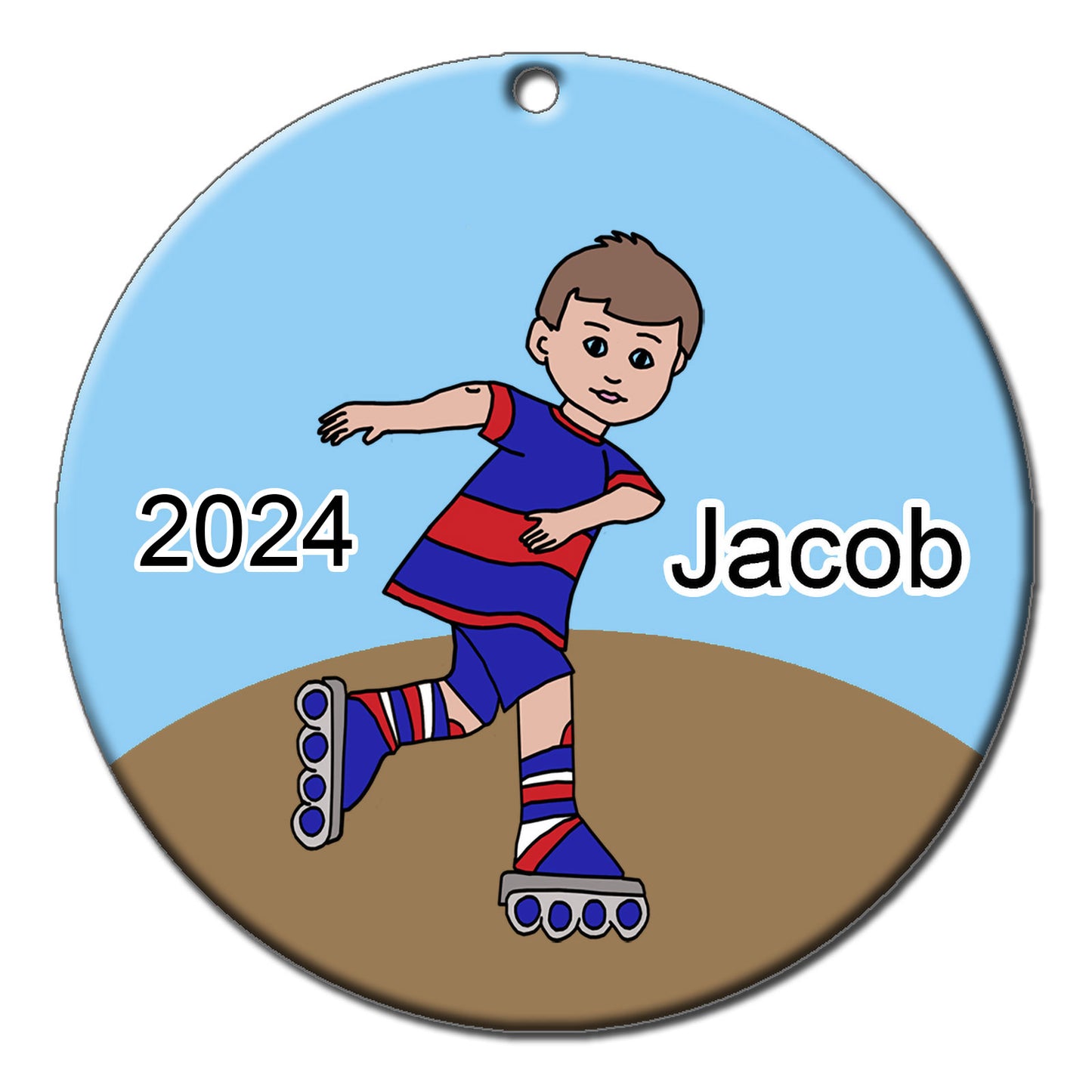 Kids who love roller skating will love this personalized roller skating Christmas ornament. Choose from 17 boys with different skin and hair colors and personalize it with your child's name and year. 2.75" flat ceramic ornament comes with gold cord for hanging.Share