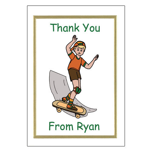 Thank your guests for coming to your skateboard theme birthday party with these personalized skateboard thank you notes for kids. Choose from 16 skateboarding boys with different skin and hair colors and personalize your note cards with your child's name and short message. Cards measure 3 1/2" x 5 and have a gold foil border. Inside is blank. Price is per pack of 10 note cards with white envelopes.Share