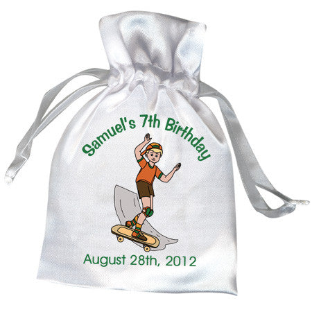 White satin drawstring favor bags printed with our skateboard boy design are perfect for kids skateboarding parties. Choose any of our skateboard boys with different skin and hair colors and personalize it with 2 lines of text.