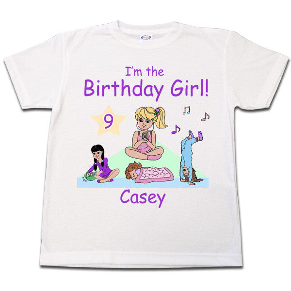Create a special personalized birthday T shirt for your daughter to wear to her sleepover birthday party. Choose from a selection of cartoon girls with different skin and hair colors and personalize it with your child's name and age.