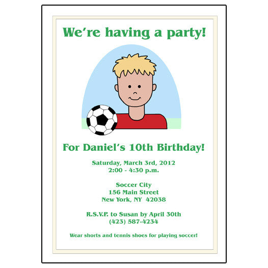 Select any one of our cartoon kids to create a special soccer birthday party invitation for your child. 5" x 7" invitations will be custom printed with your headline, text, and choice of font color. Cards are white with a pearl foil border. Price is per card. Plain white envelopes are included.