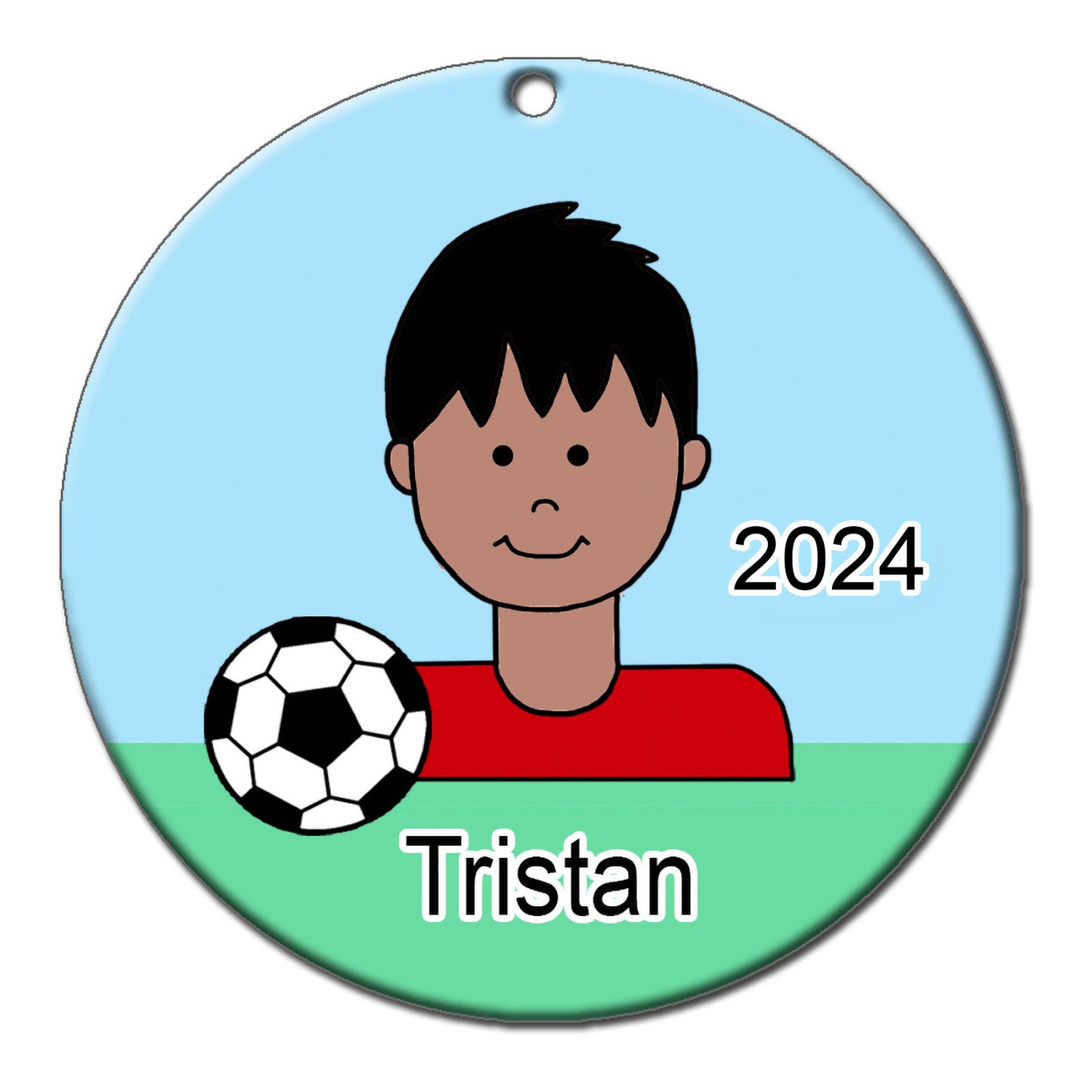 Kids who love soccer will love this personalized soccer Christmas ornament. Choose any of our cartoon boys with different skin and hair colors and personalize it with your child's name and year. 2.75" flat ceramic ornament comes with gold cord for hanging.Share