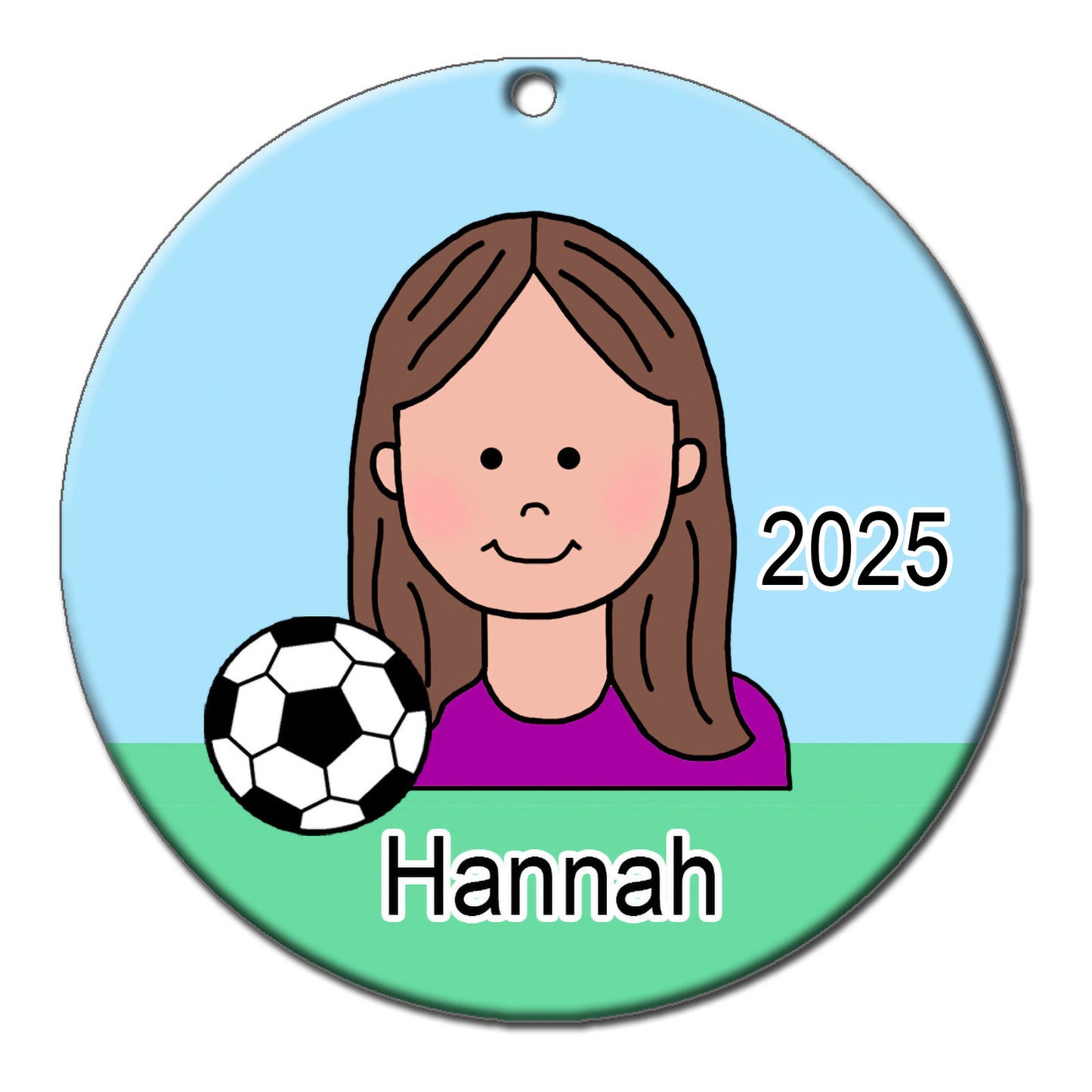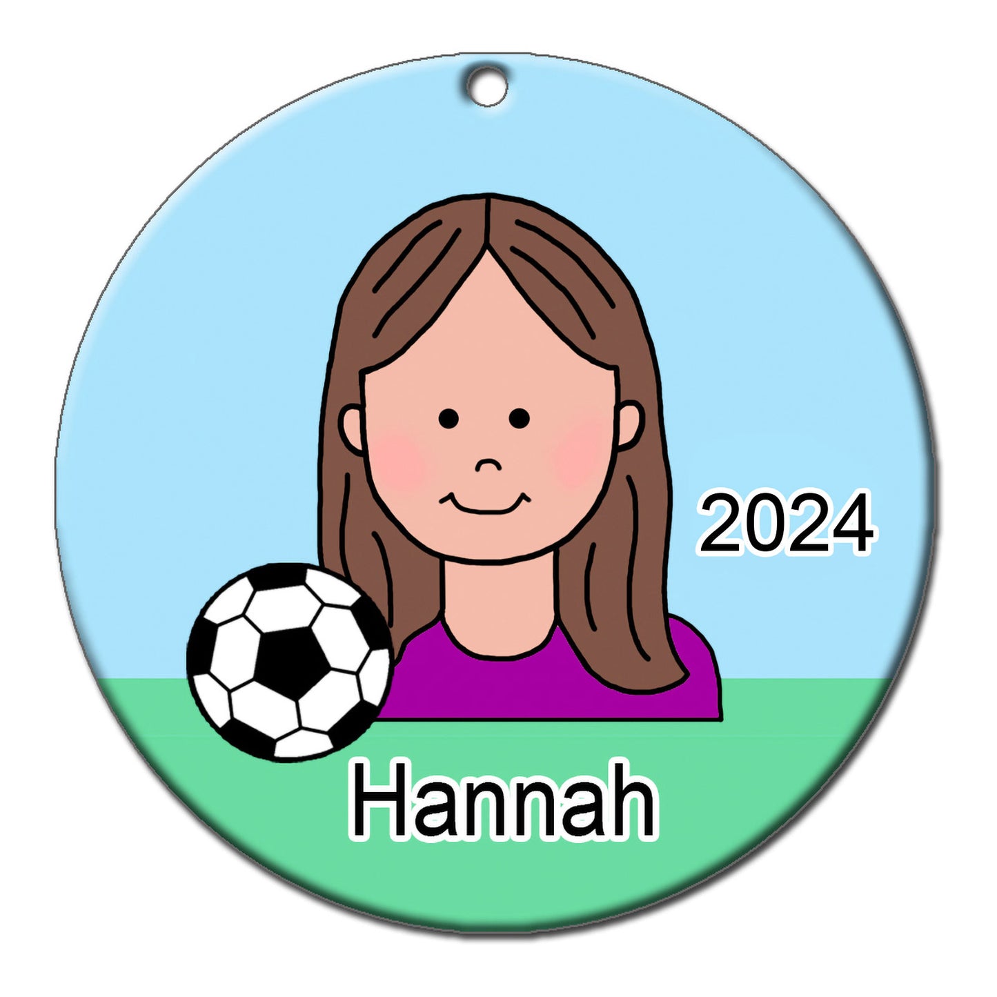 Kids who love soccer will love this personalized soccer Christmas ornament. Choose any of our cartoon girls with different skin and hair colors and personalize it with your child's name and year. 2.75" flat ceramic ornament comes with gold cord for hanging.Share