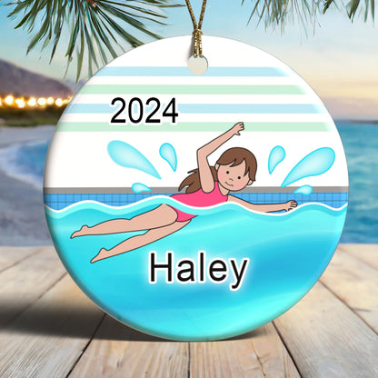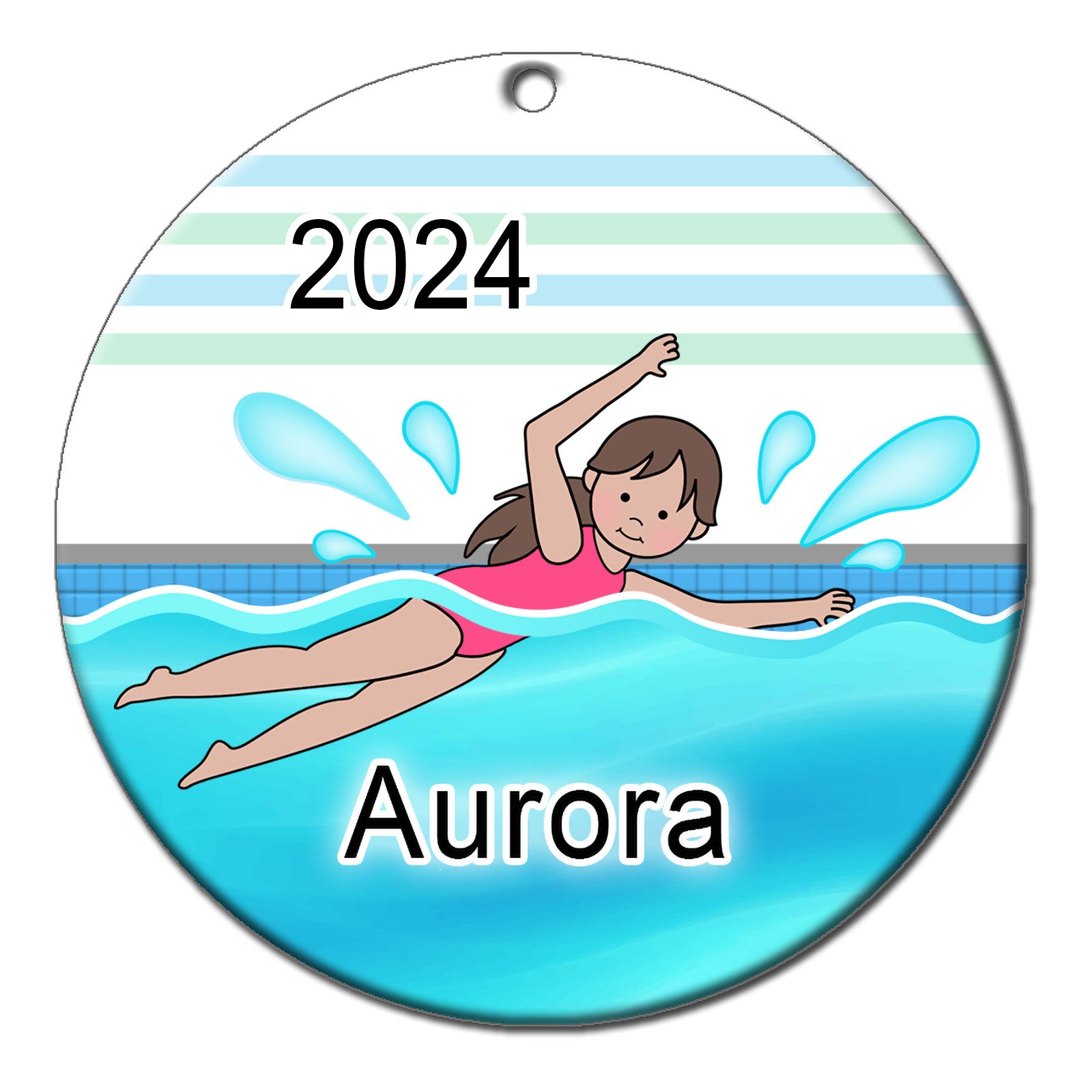 If your daughter loves swimming, or is on the swim team, she will love this personalized swimming girl Christmas ornament. Choose from a selection of girls with different skin and hair colors and personalize it with your child's name and year. 2.75" flat ceramic ornament comes with gold cord for hanging.Share