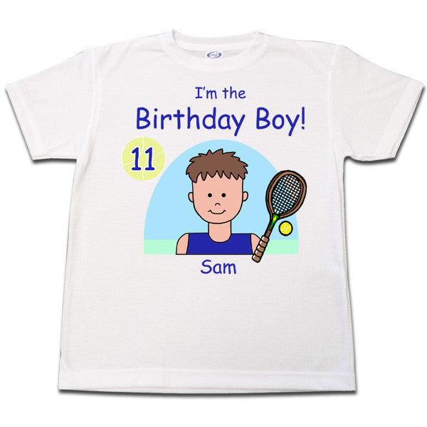 Create a special birthday T shirt for any kid who loves tennis! Choose any one of our cartoon boys with any skin or hair color and personalize the shirt with your child's name and age. Perfect for wearing to your tennis theme birthday party.