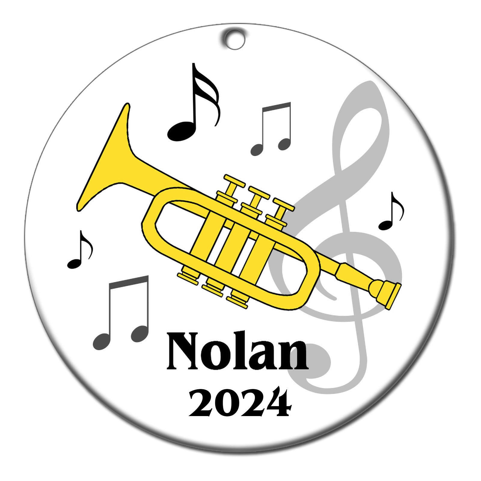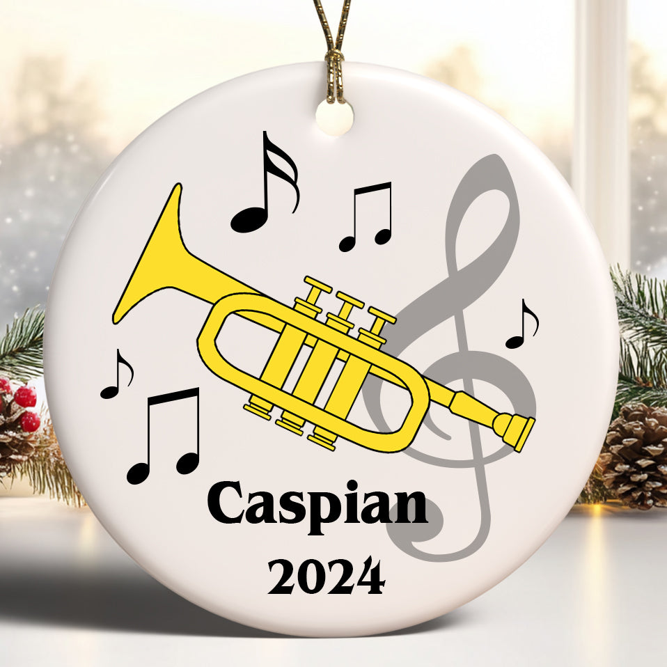 Your favorite trumpet player will love this extra special personalized Christmas ornament. Ornament features a trumpet and musical notes and is personalized with name and year. A perfect gift for anyone who loves the trumpet. 2.75" flat ceramic ornament comes with gold cord for hanging.Share
