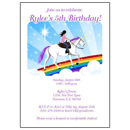 Invite your guests to join you for the party of their dreams with these magical unicorn birthday party invitations. Choose from 6 girls with different skin and hair colors to create a beautiful invitation for your daughter's Unicorn Dreams birthday party theme. 5" x 7" cards are custom printed in full color with your own headline, wording, and choice of font color. Price is per card. Plain white envelopes are included.