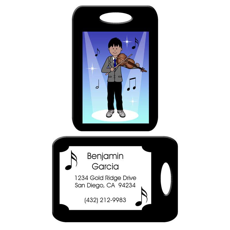Personalized violin boy bag tag is perfect for identifying music bags, backpacks or luggage. Great violin recital gift! Choose from 9 violin playing boys with different skin and hair colors. Back side of the bag tag is custom printed with your name, address, and phone #. 4" x 3" durable thick plastic tag, rubber strap included.Share