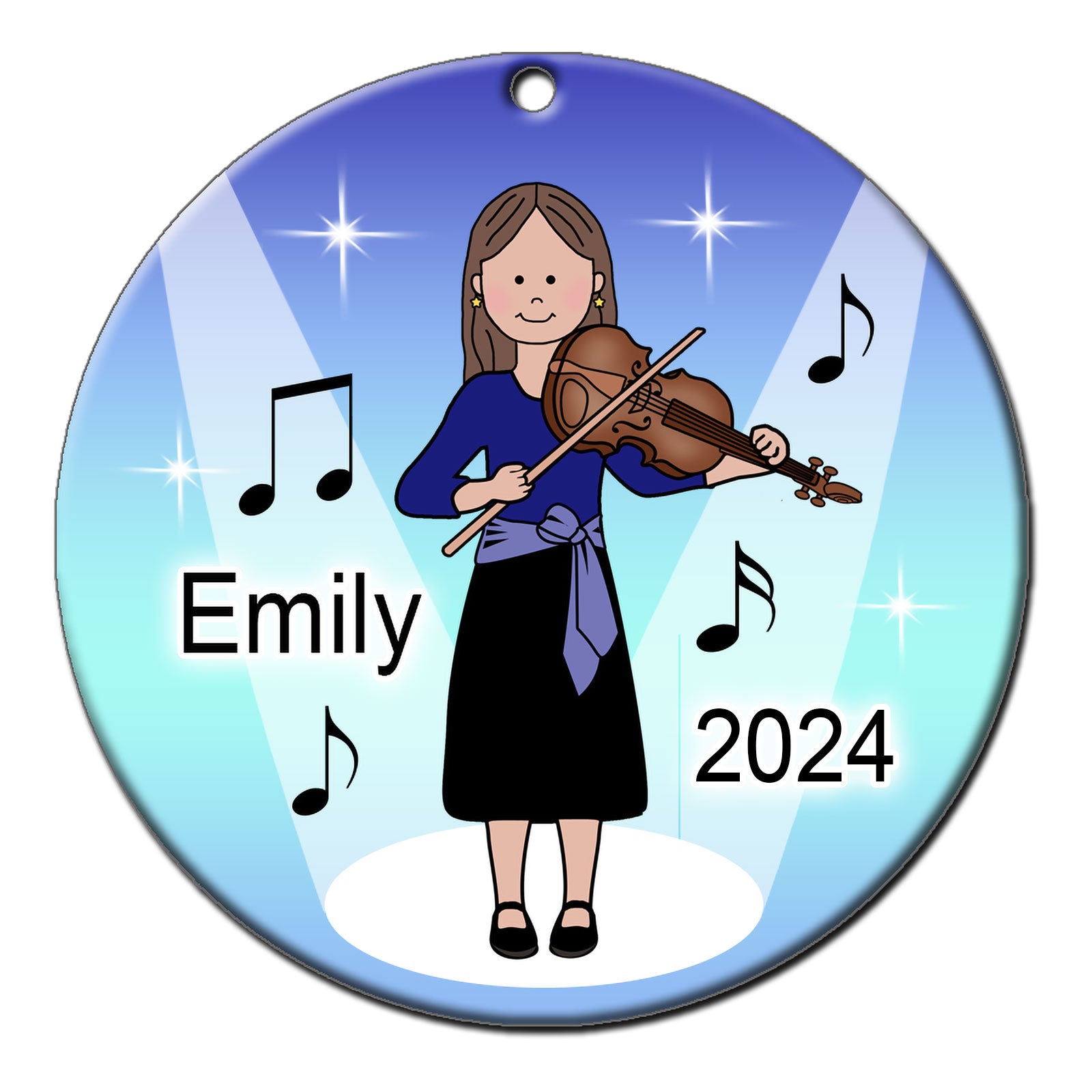 Your little violin player will love this extra special personalized Christmas ornament. Choose from 9 violin playing girls with different skin or hair colors and personalize it with her name and the year. A perfect gift for any girl who loves violin music. 2.75" flat ceramic ornament comes with gold cord for hanging.Share