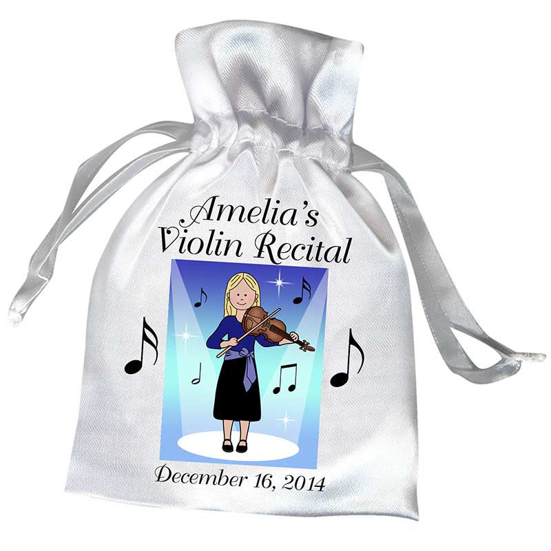 These white satin drawstring party favor bags feature our violin recital girl design. Choose the skin & hair color for the violin playing girl and personalize it with your own special message.